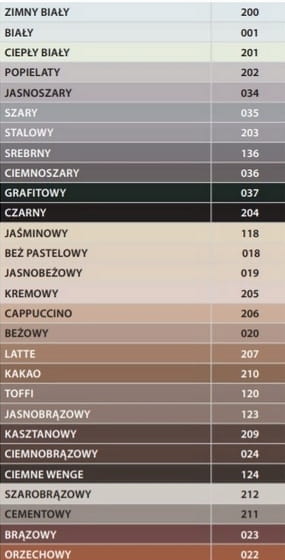 Trwałe i intensywne kolory na lata - cechuje się wysoką odpornością na promieniowanie UV dzięki zastosowaniu specjalnych, ściśle wyselekcjonowanych pigmentów nieorganicznych, dodatkowo chronionych przed degradacją za pomocą hydrofobowego polimeru oraz dwutlenku tytanu.